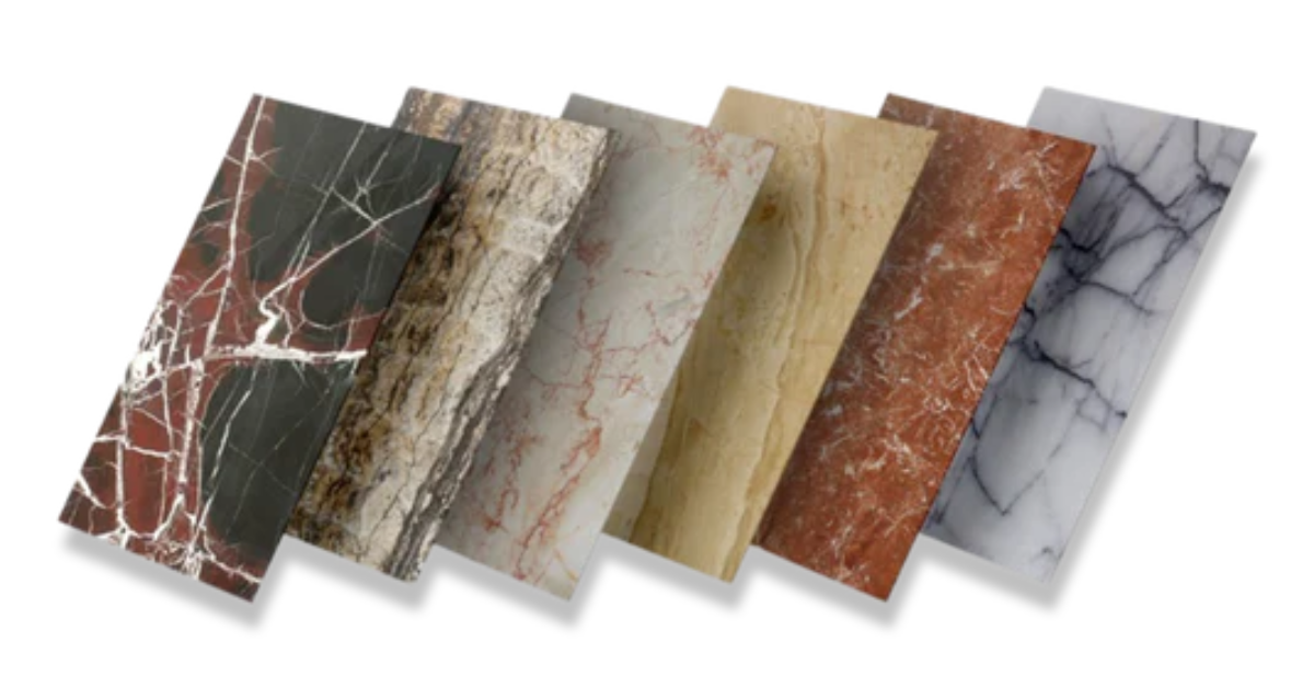 Imported from top quarries in Italy, these include Carrara, Calacatta, and Botticino, known for their rich veining and polished finishes.